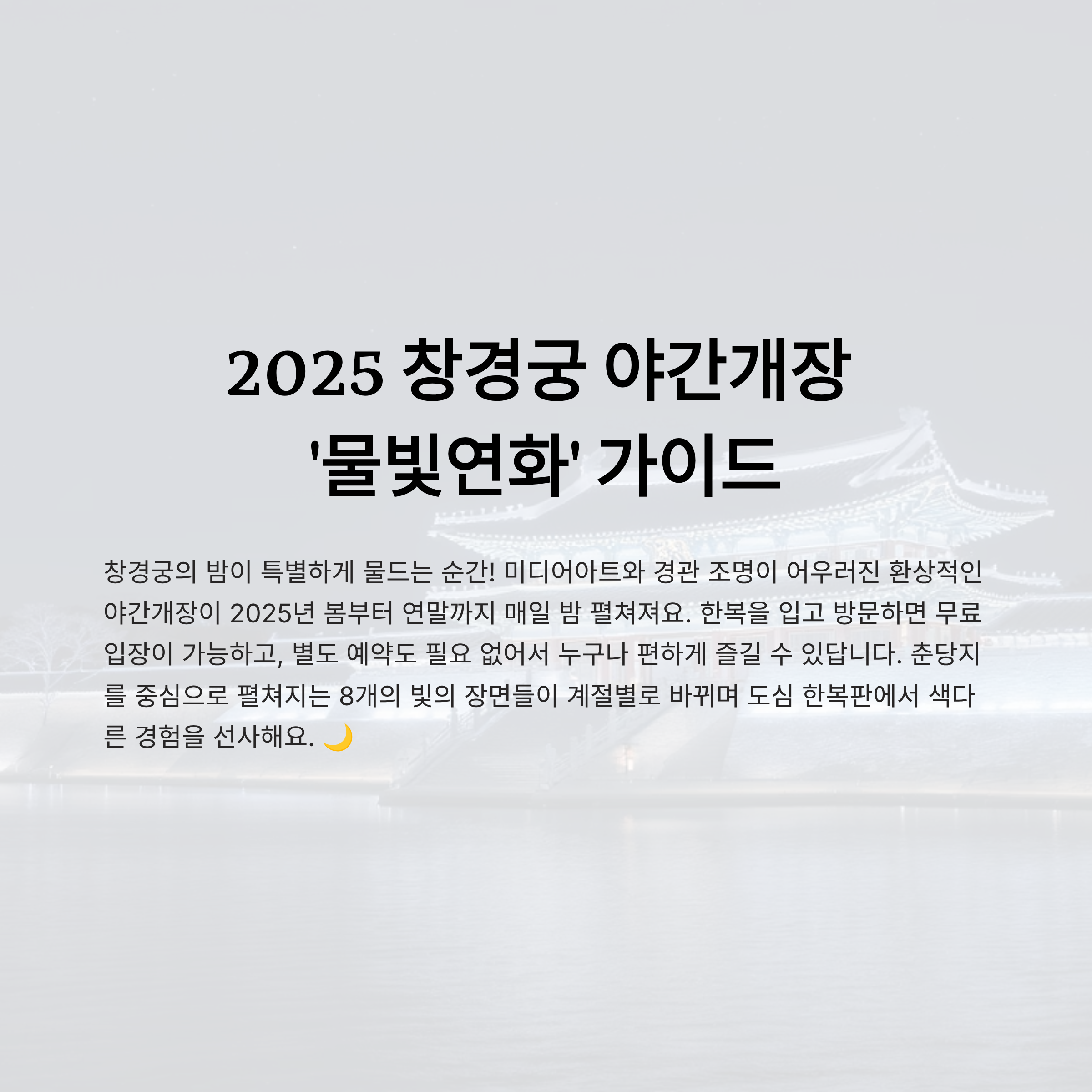 2025년 창경궁 야간개장은 '물빛연화'라는 이름으로 진행되고 있어요. 이 행사는 미디어아트와 야경 조명이 어우러진 문화 프로그램으로, 고궁의 아름다움을 색다르게 느낄 수 있는 기회를 제공해줘요. 매일 오후 7시부터 9시까지 운영되며, 월요일은 휴궁일이라 방문 전 참고하는 것이 좋아요.