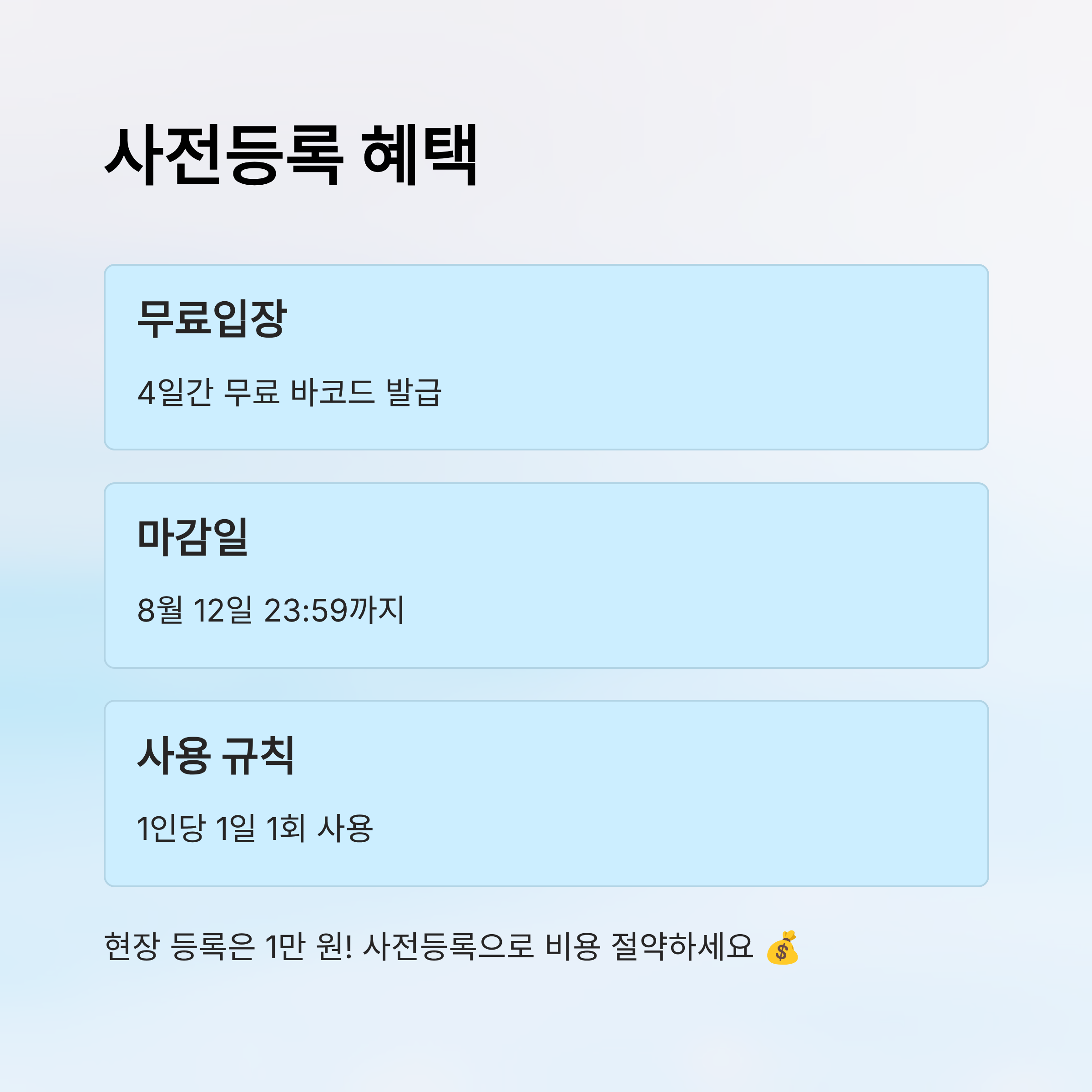 사전등록 마감은 8월 12일 23:59까지예요. 이때 등록하면 행사 4일간 사용할 수 있는 무료 입장 바코드가 발급돼요. 1인당 1일 1회 사용 규칙이에요.