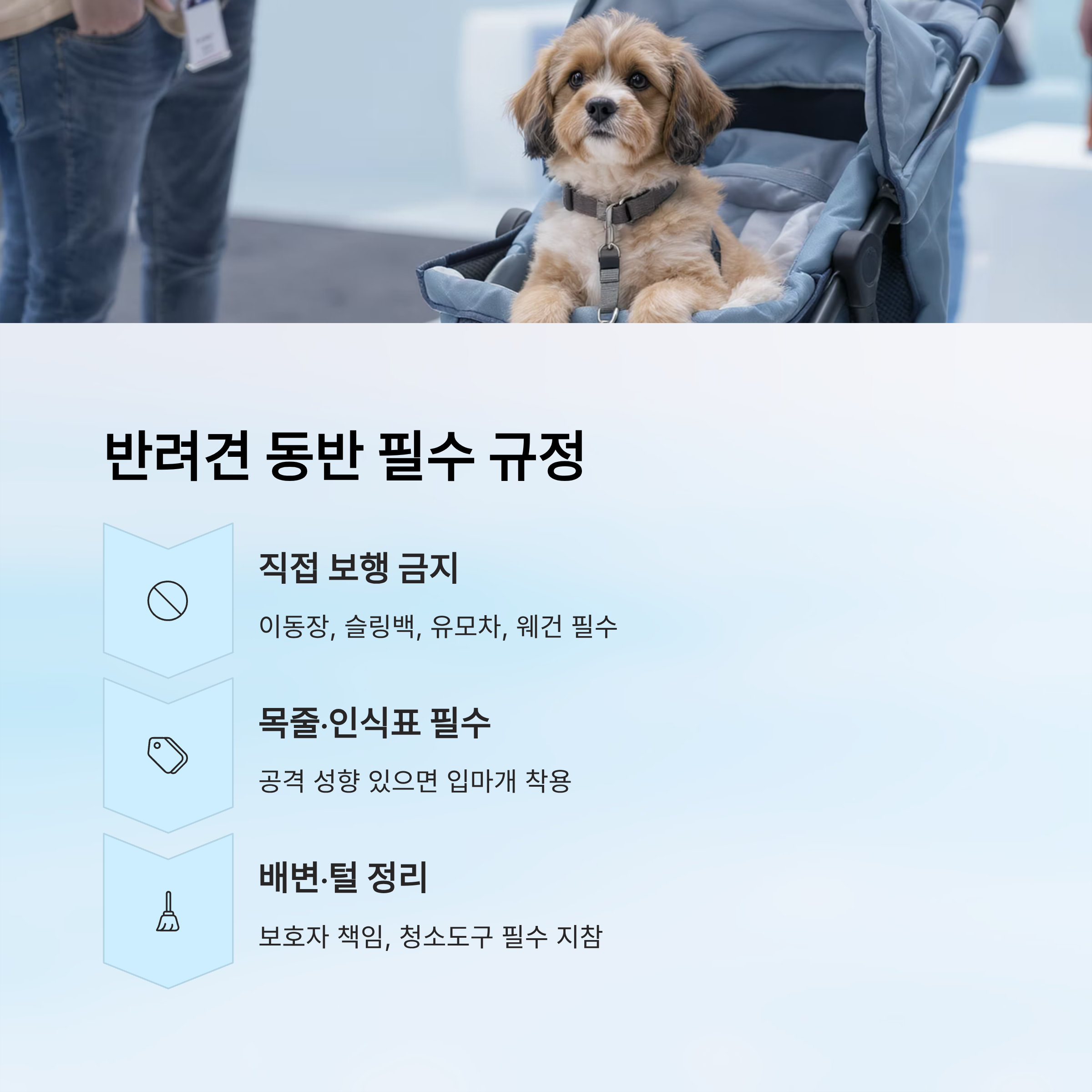 반려견 동반은 가능하지만 직접 보행은 금지되어 있어서 이동장, 슬링백, 유모차, 웨건 중 하나를 반드시 사용해야 해요. 목줄과 인식표는 기본이고, 공격 성향이 있는 친구는 입마개가 필요해요. 배변과 털 정리는 보호자의 필수 책임이라는 점도 기억해 주세요. 🐶