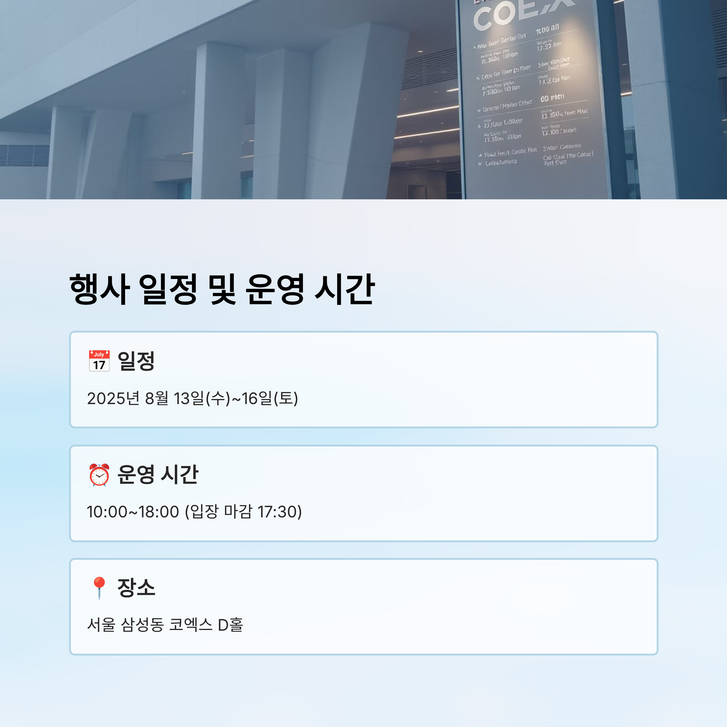 기간은 2025년 8월 13일(수)부터 16일(토)까지 4일간이고, 장소는 서울 삼성동 코엑스 D홀이에요. 날짜가 요일과 함께 명시되어 있어 일정 계획 세우기 쉬워요.