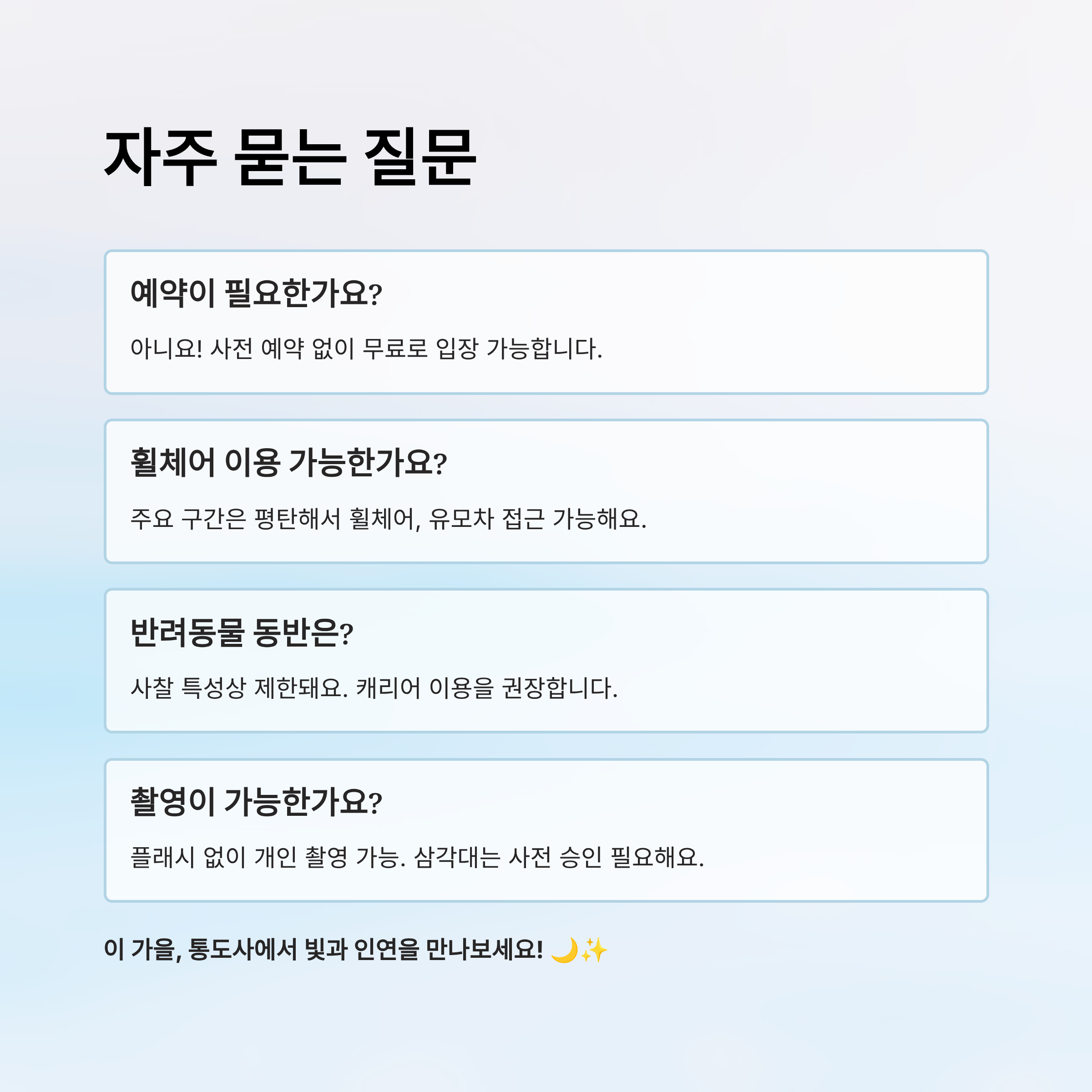 🧘♂️ 전통 사찰이므로 음식을 반입하거나 큰 소리로 통화하는 것은 자제하는 매너도 필요해요. 관람 예절을 지키며 모두가 편안하게 즐기는 분위기를 함께 만들어봐요.