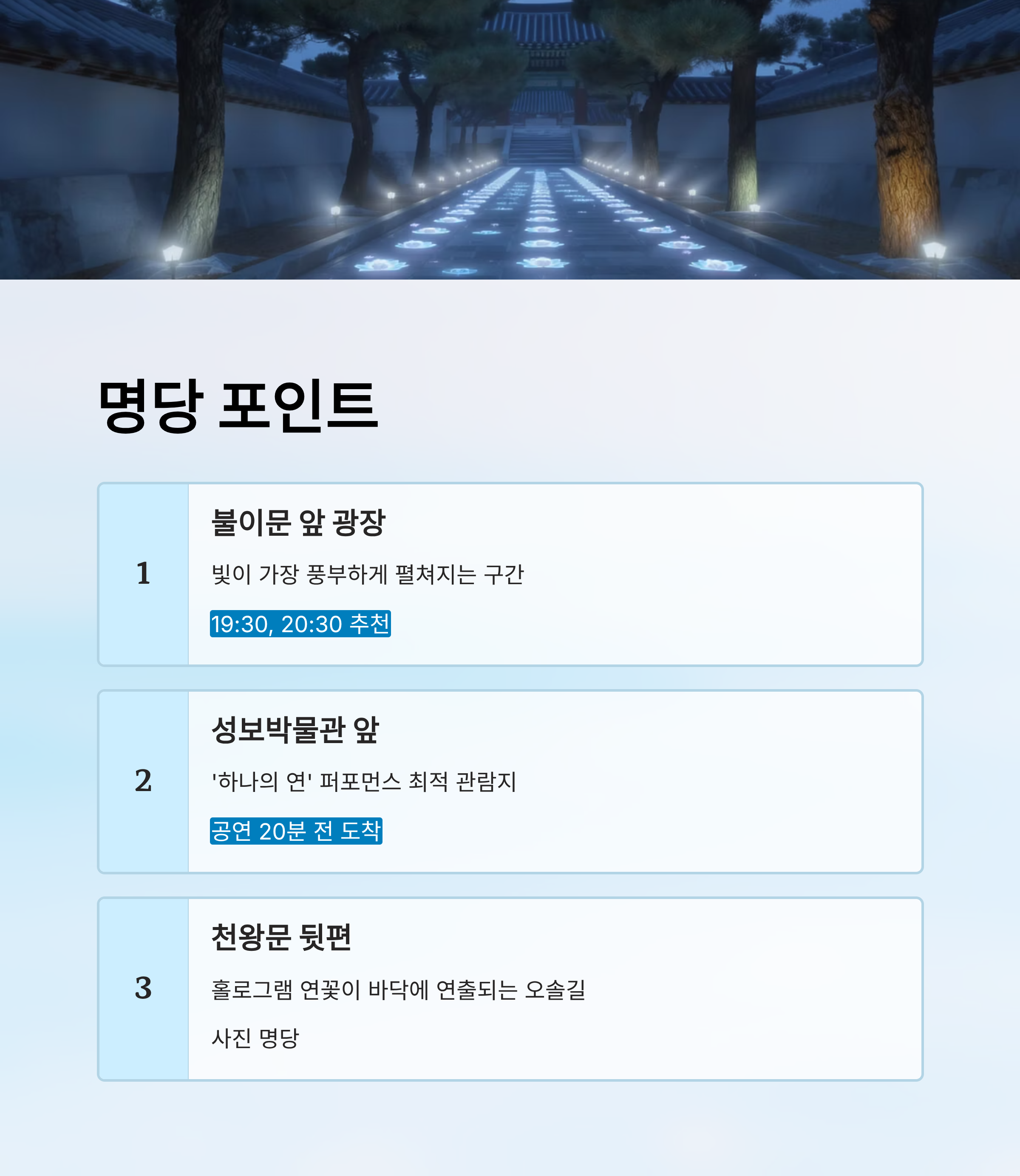 🌙 또 하나, 조명 효과는 해가 완전히 진 뒤에 가장 아름답게 연출돼요. 일몰 이후 19:00~19:10 사이에 입장하면 황혼부터 야경까지 자연스럽게 연결된 풍경을 볼 수 있어요.