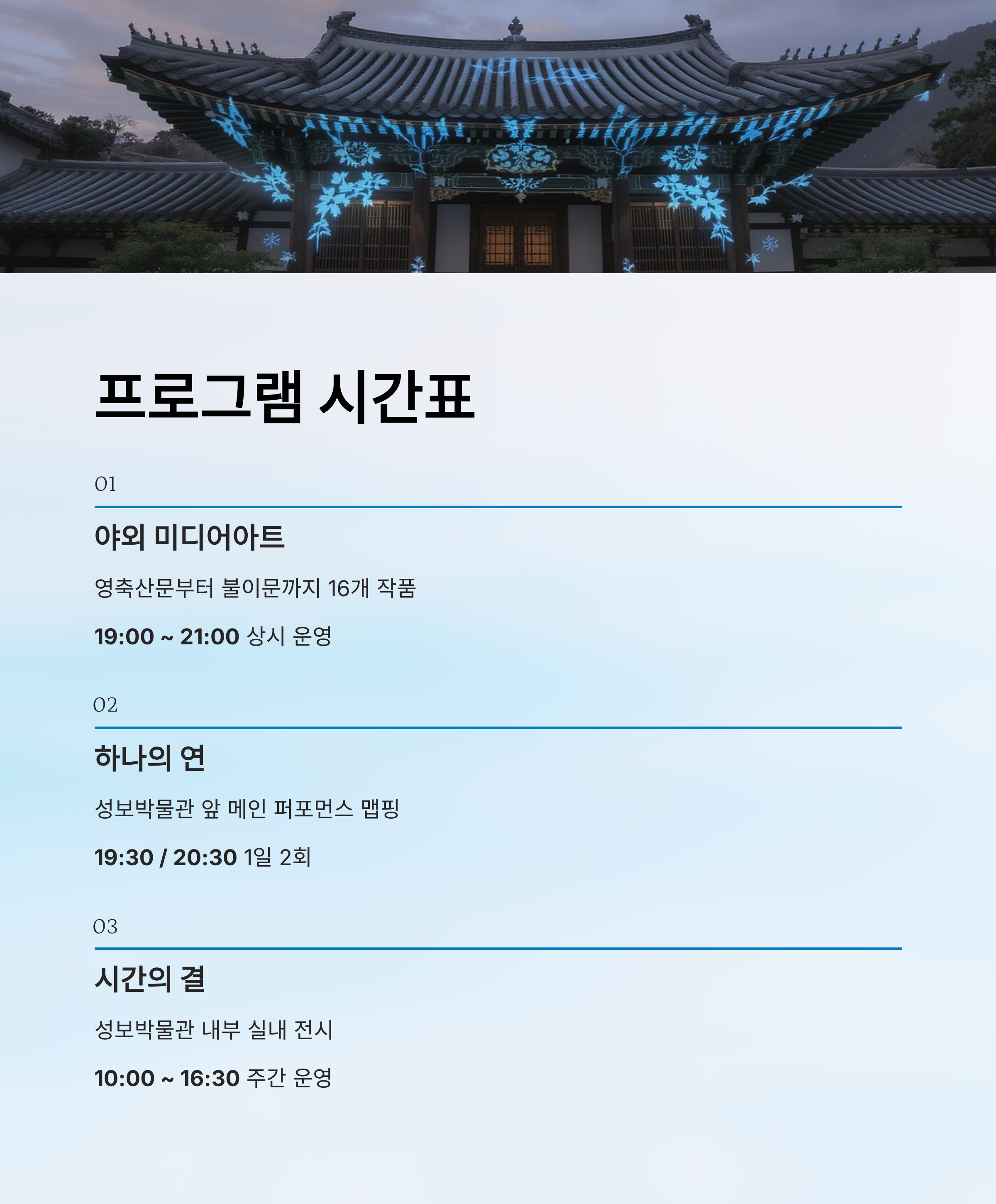 1~16 | 야외 미디어아트 콘텐츠 (문, 경내) | 영축산문~불이문 | 19:00 ~ 21:00 |