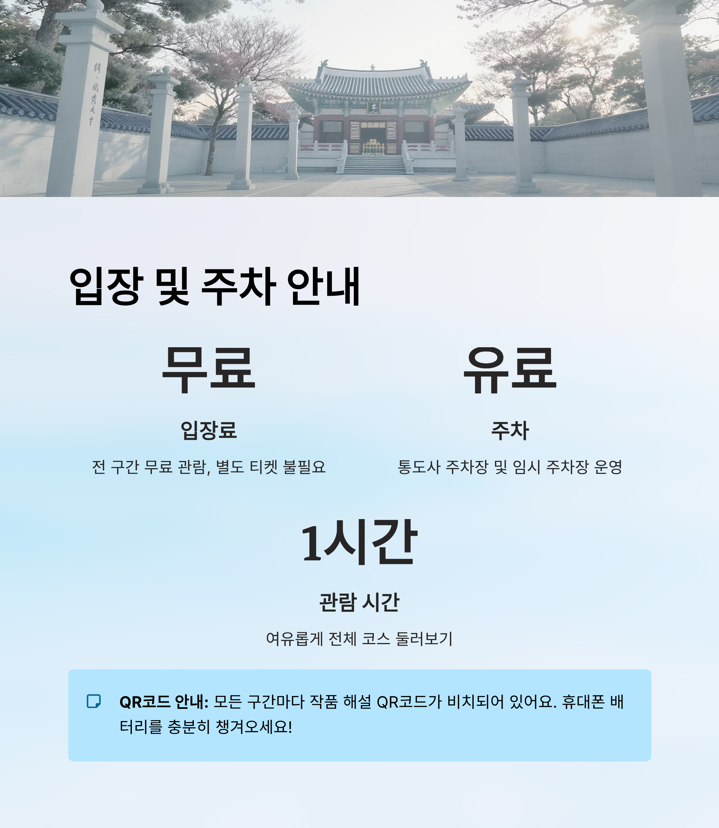 📱 현장 안내: 모든 문과 구간마다 QR코드가 비치되어 있어 작품 해설과 설명 영상을 쉽게 확인할 수 있어요. 휴대폰 배터리 충분히 챙겨오세요!