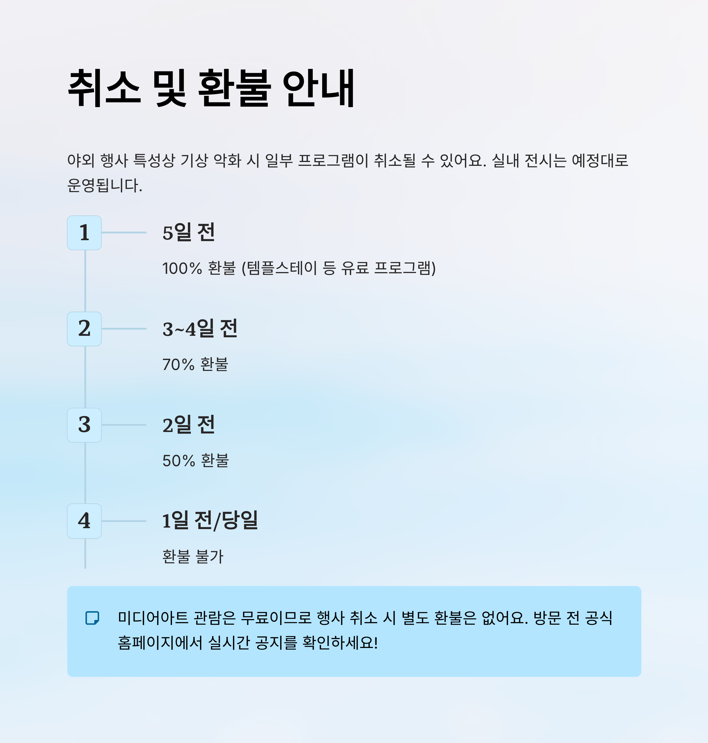 💸 입장료는 무료이기 때문에, 행사 자체의 취소에 따른 환불은 해당되지 않아요. 단, 별도로 예약한 템플스테이나 국가유산 방문 캠페인 프로그램에 대한 환불은 다음 기준을 참고해주세요.