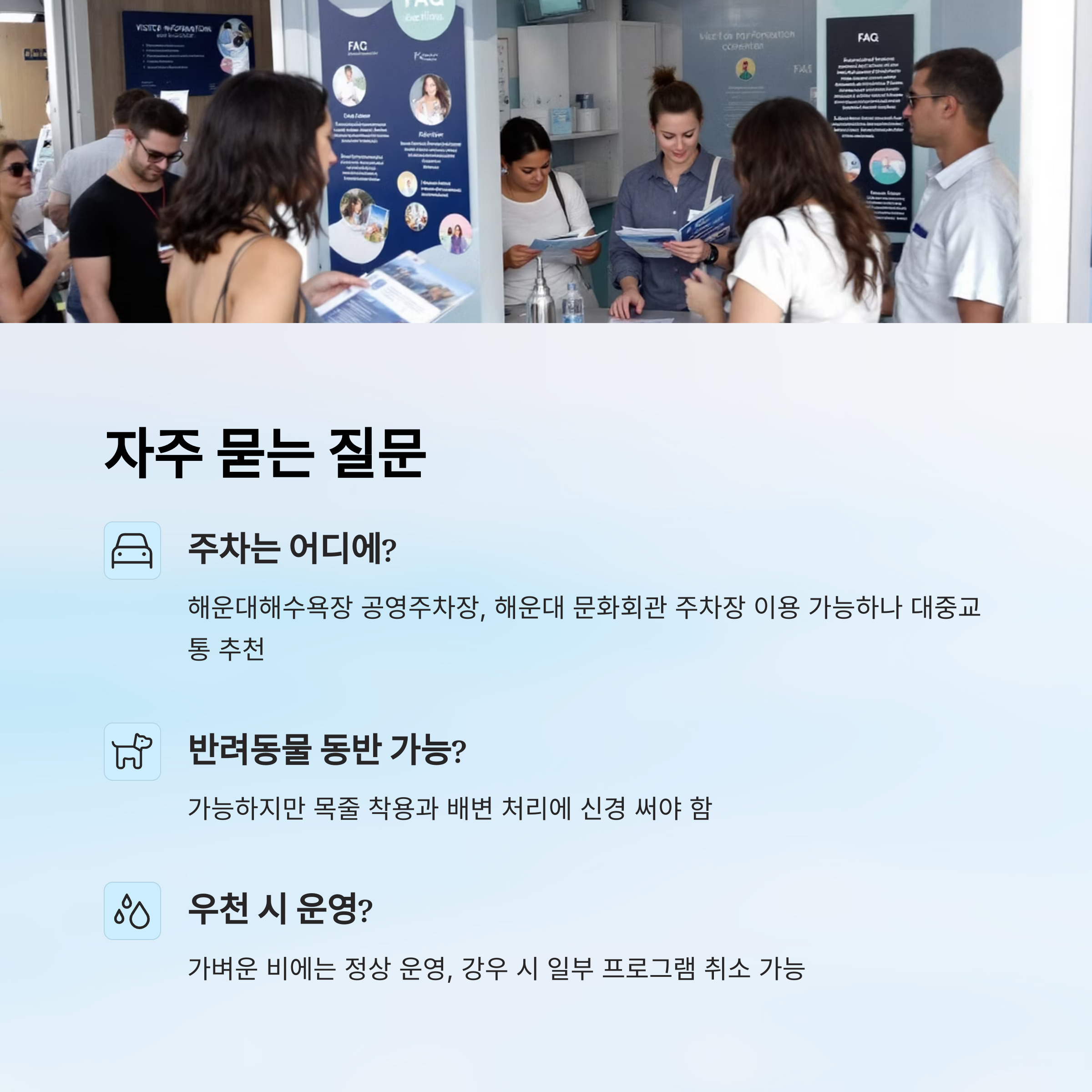 A4. 야외 행사라 반려동물 출입은 가능하지만, 사람이 많은 시간에는 목줄 착용과 배변 처리에 꼭 신경 써야 해요 🐶