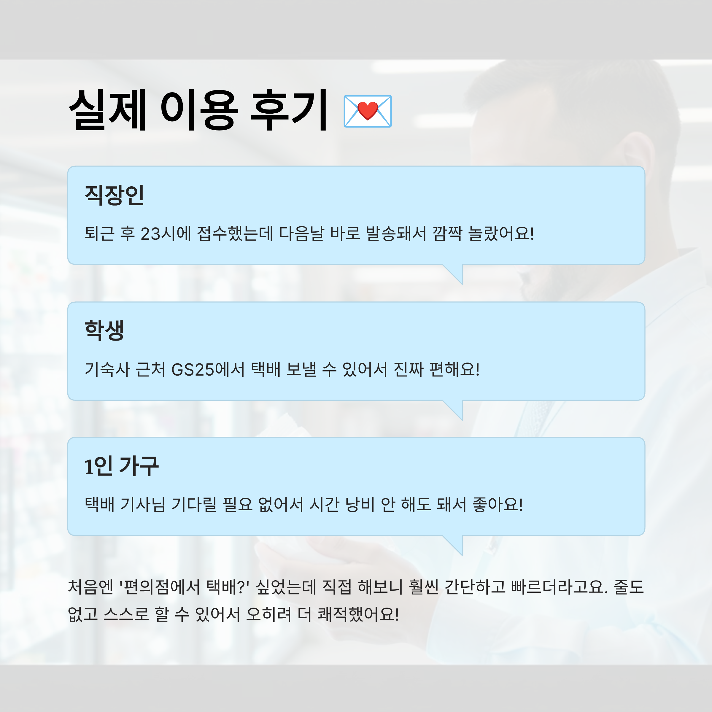 | 학생 | 기숙사 근처 GS25에서 택배 보낼 수 있어서 진짜 편해요! |