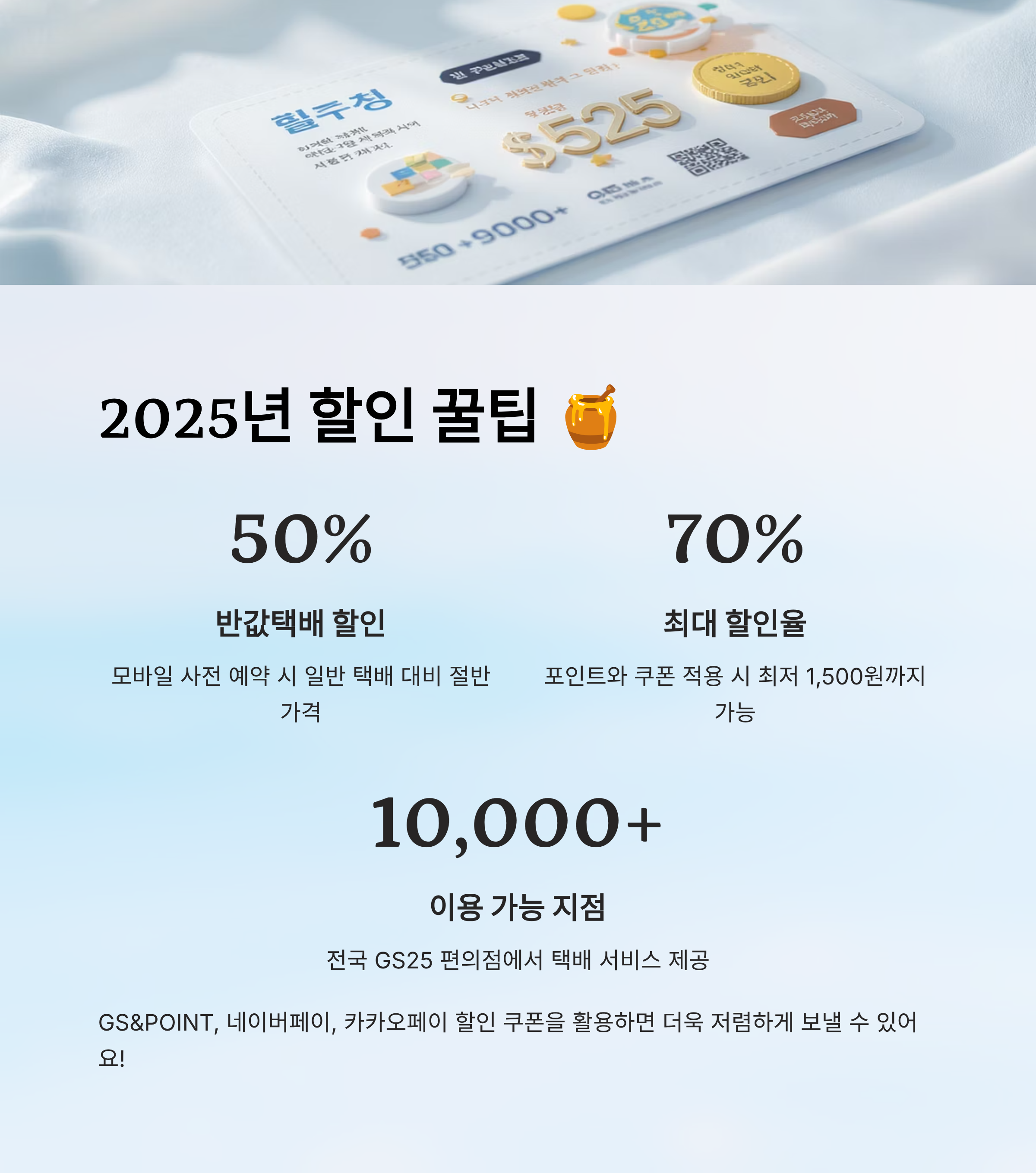 💡 네이버페이 포인트, 카카오페이 할인 쿠폰 등도 종종 연동되기 때문에 택배 예약 전에 이벤트 페이지를 꼭 확인해 보는 게 좋아요. GS25 앱, CJ대한통운 앱, 네이버 쇼핑라이브 등을 통해 쿠폰을 받을 수 있답니다!