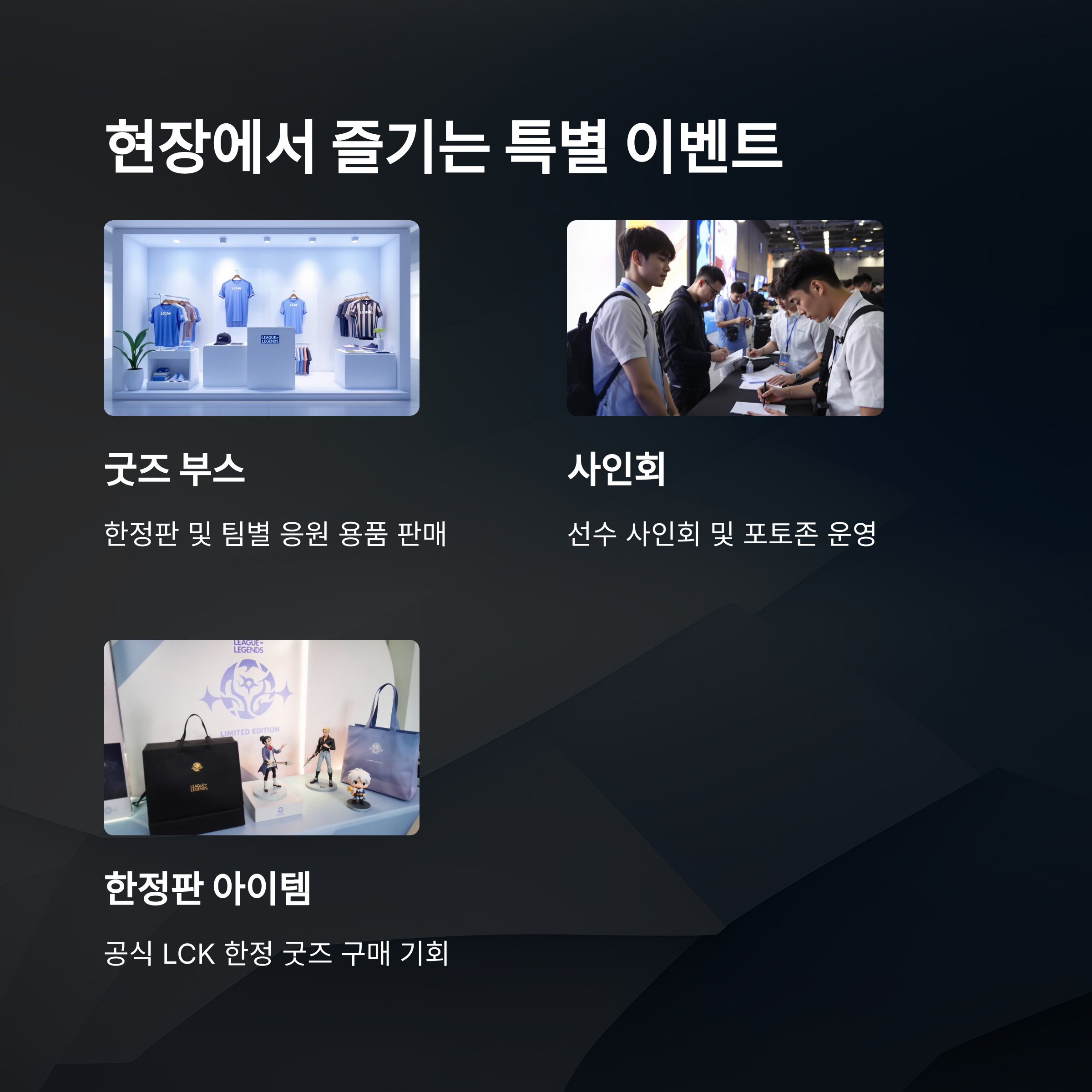 LCK는 현장에서 팬들을 위한 다양한 이벤트와 한정 굿즈 판매로 유명해요. 2025 시즌도 예외 없이 특별 제작 굿즈와 팬 사인회, 미니 팬미팅, 포토부스 등으로 가득 차 있어요. 팬들에게 특별한 추억을 안겨주기 위한 노력들이 매 경기마다 준비돼 있답니다. 🎊