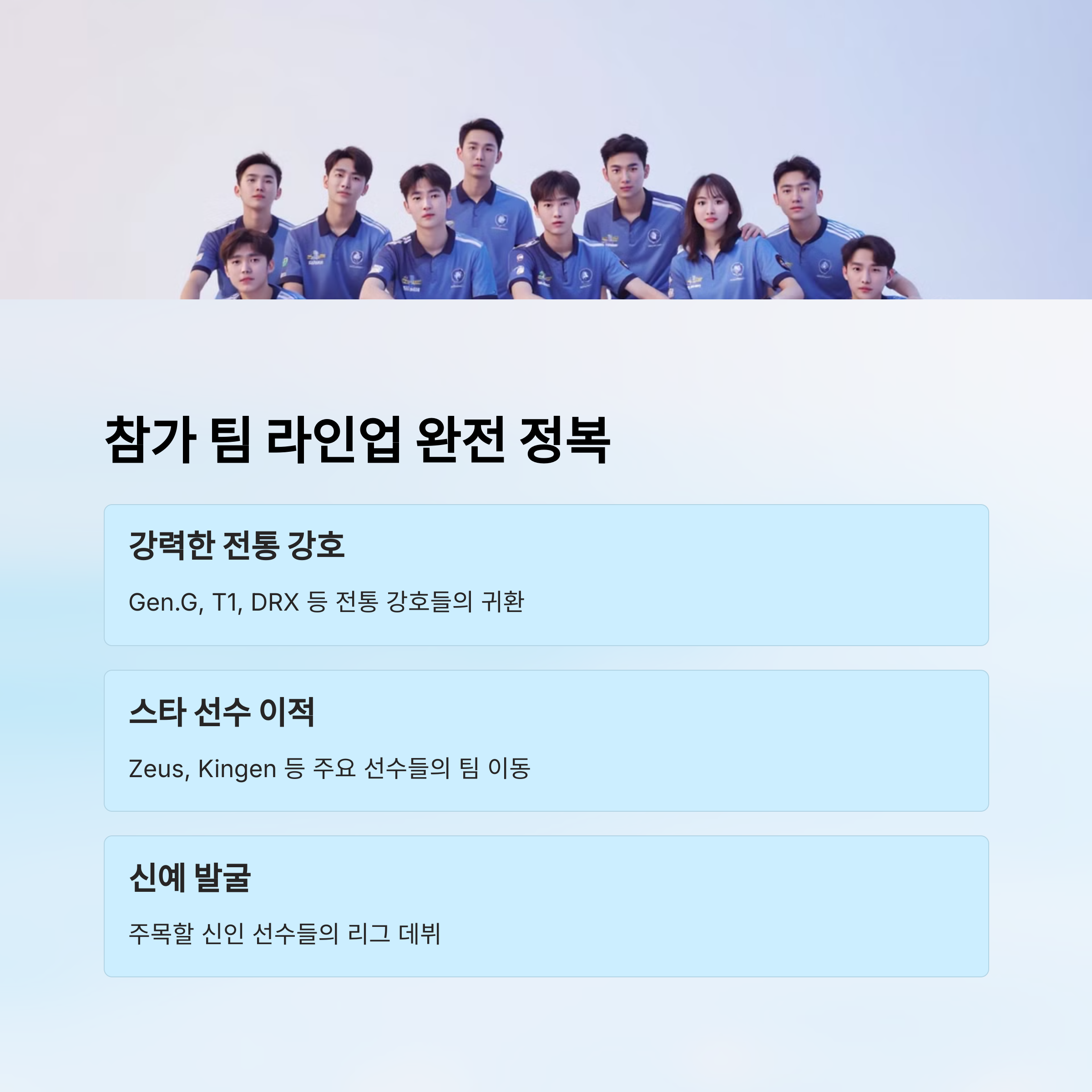 이번 시즌은 유저들이 가장 궁금해하는 이적 시장 변화부터, 새로운 메타와 전술, 그리고 T1, Gen.G, KT 등 인기 팀의 라인업 변화까지 풍성한 볼거리가 가득하답니다. 💥