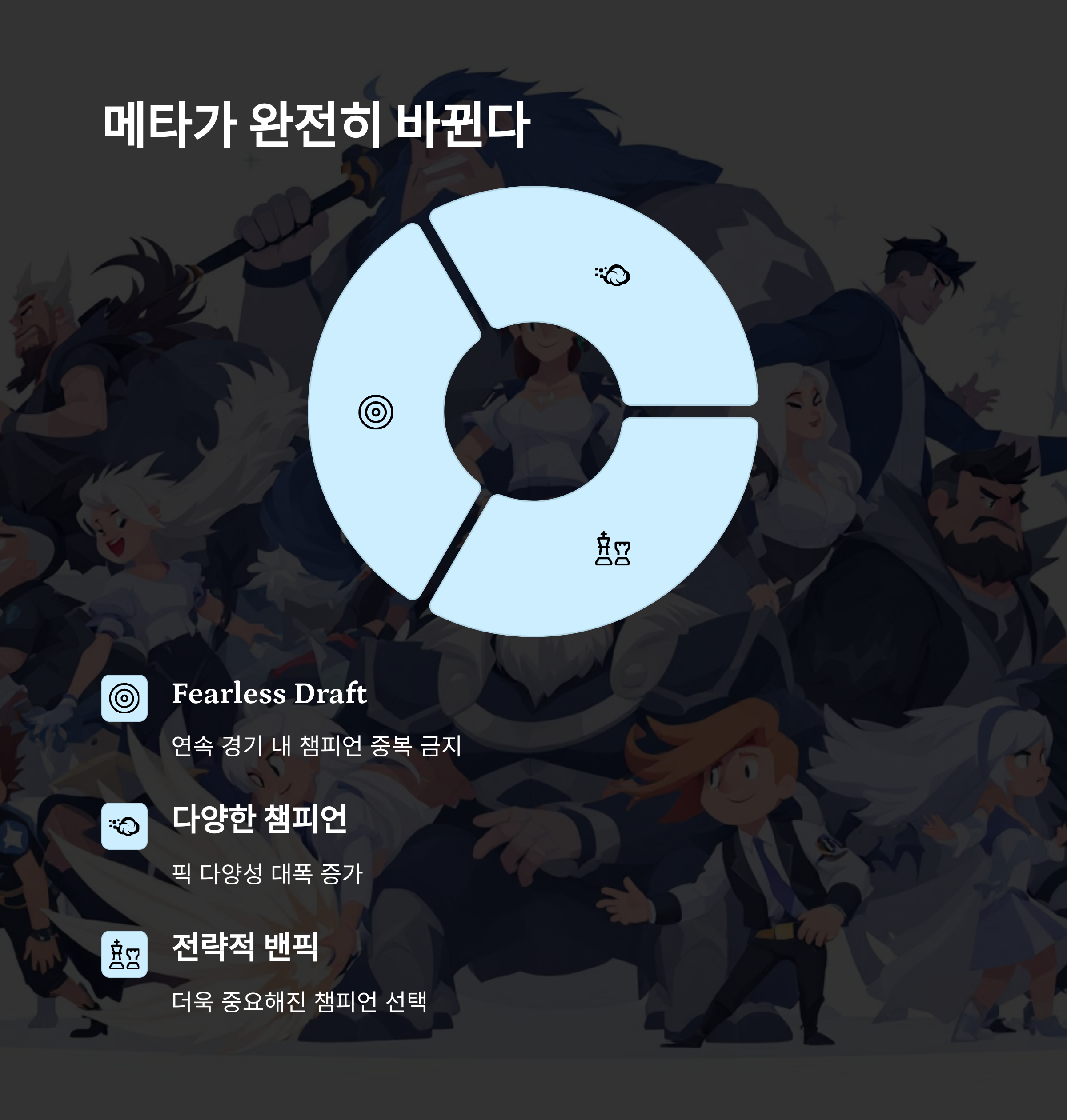 밴픽의 중요성도 더욱 커졌어요. 특정 챔피언을 가져오는 것이 팀 전략과 직결되기 때문에, 단순 카운터픽이 아닌 전체 구도를 보는 시야가 중요해졌답니다.