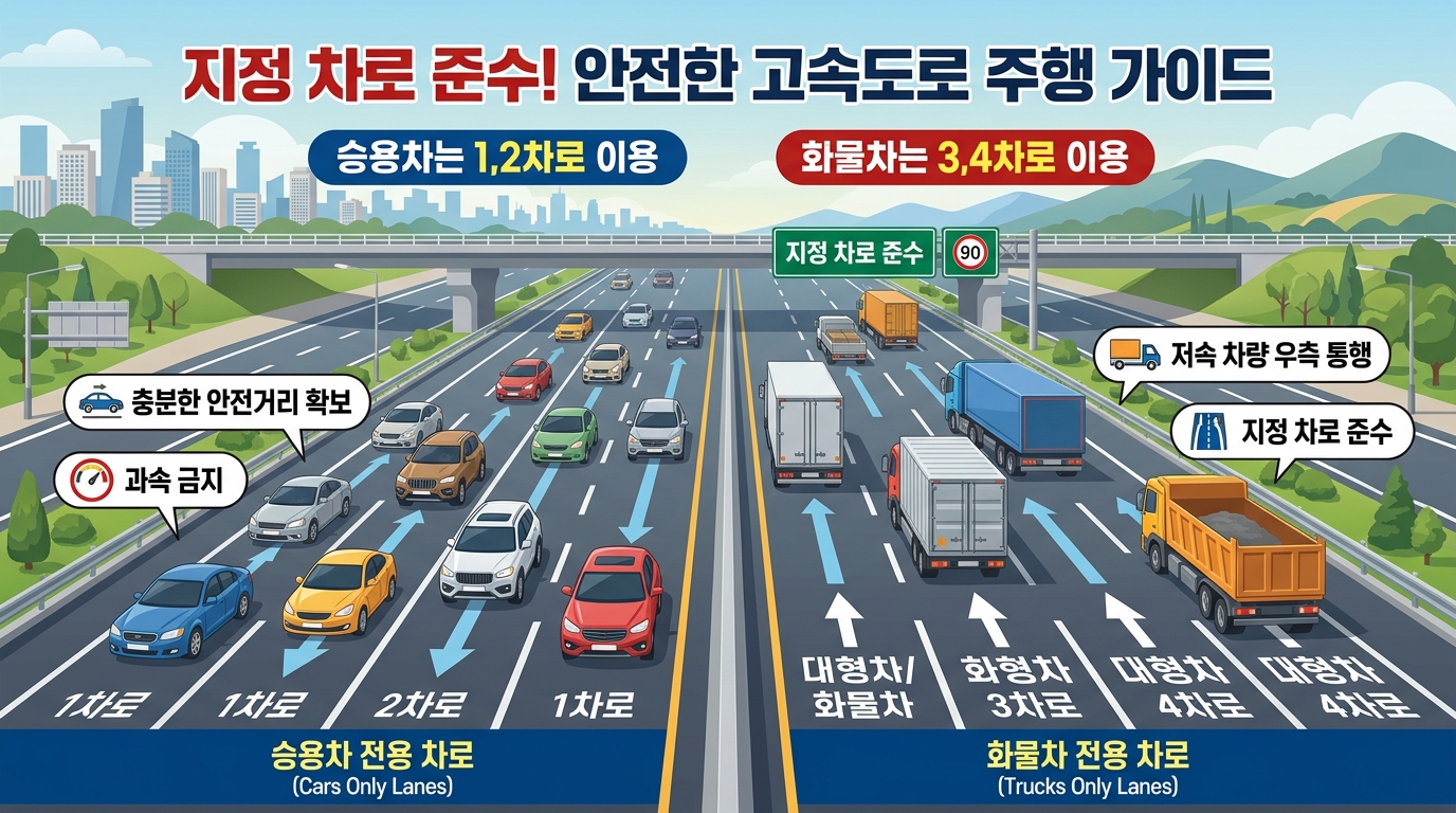 - 1차로는 추월 전용: 정체 시(80km/h 미만)를 제외하고는 추월 후 반드시 2차로로 복귀해야 합니다.