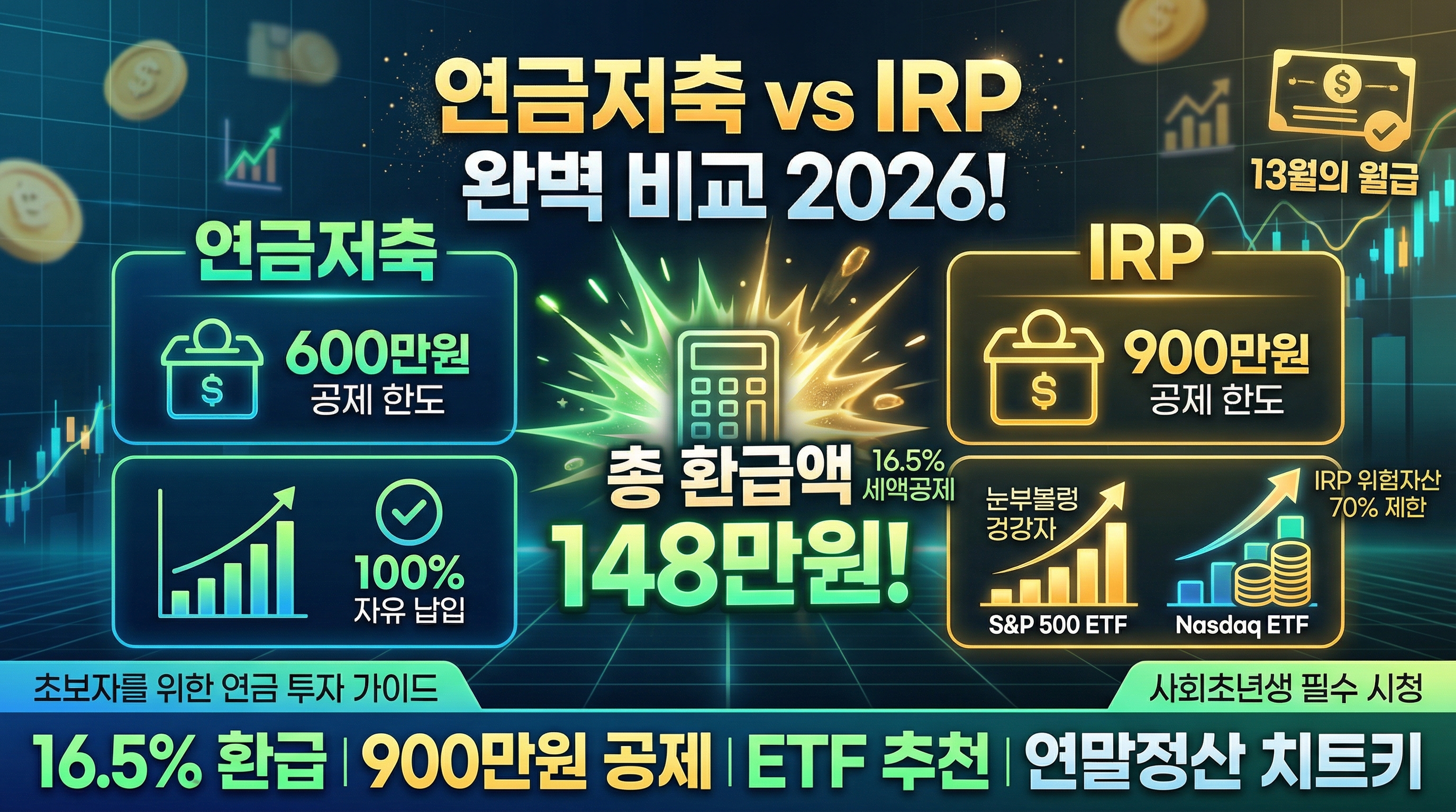 - 계좌 조합: 연금저축(공격적 투자) + IRP(안정적 투자)