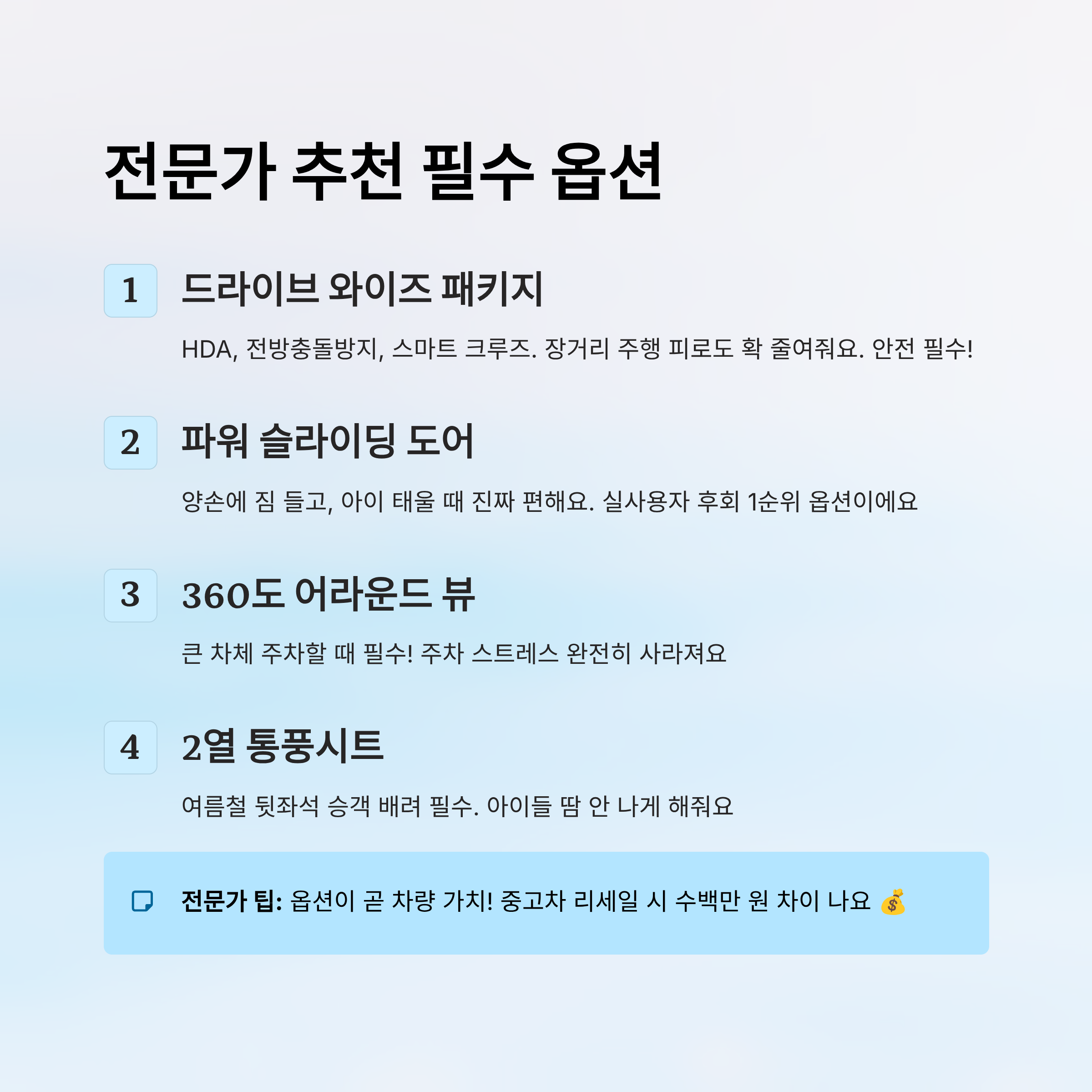 차량을 살 때 가장 많이 듣는 후회 중 하나는 “이 옵션 왜 안 넣었을까?”예요. 특히 카니발처럼 덩치 크고 가족 중심의 차량에서는 꼭 필요한 옵션이 몇 가지 있어요. 전문가들은 ‘단순 편의’를 넘어 ‘안전’과 ‘가치 유지’를 고려한 옵션 선택이 중요하다고 말해요.
