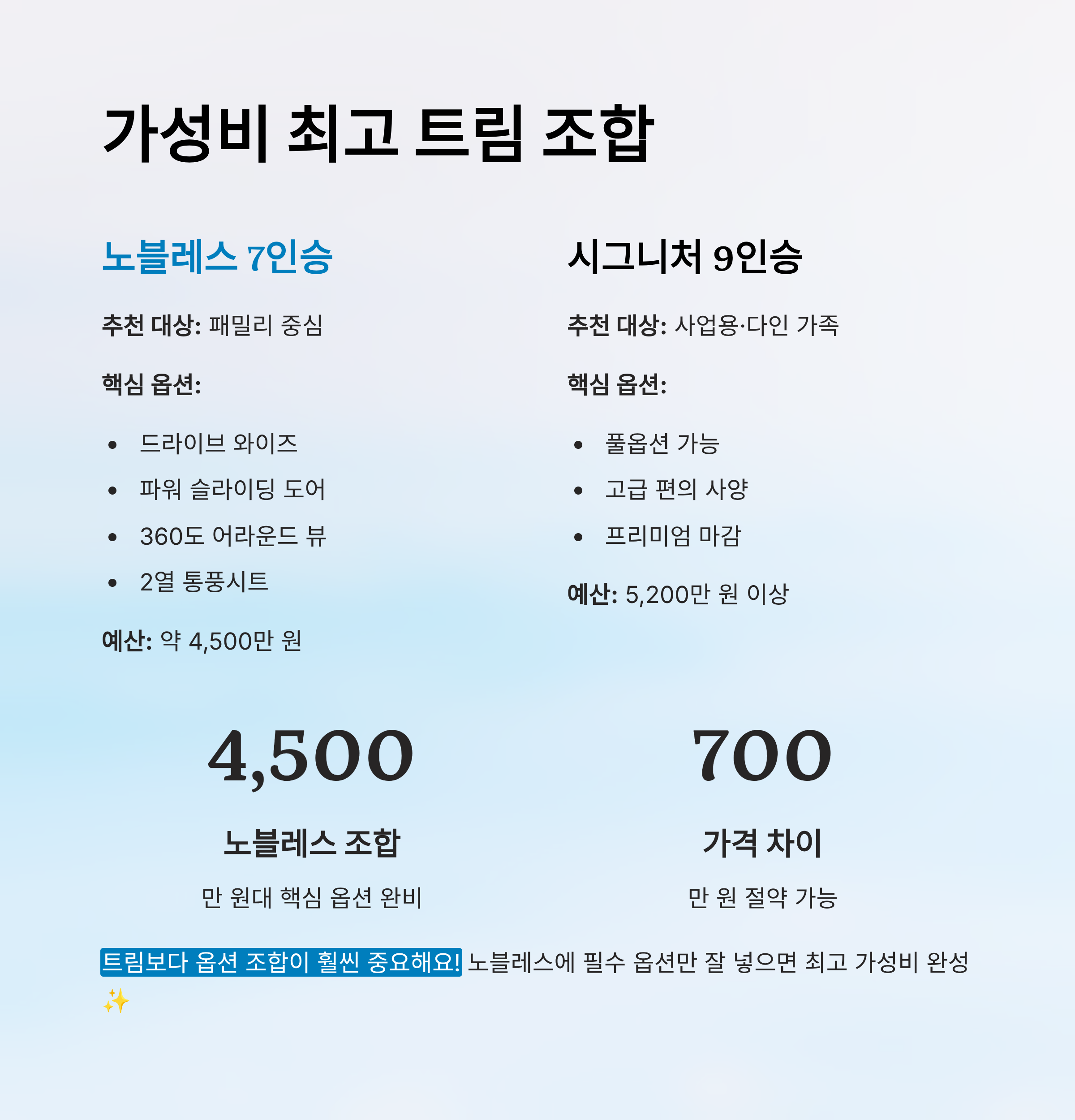 | 7인승 노블레스 | 가족용 최적화, 옵션 유연성 우수 | 3,700만~4,200만 원 |