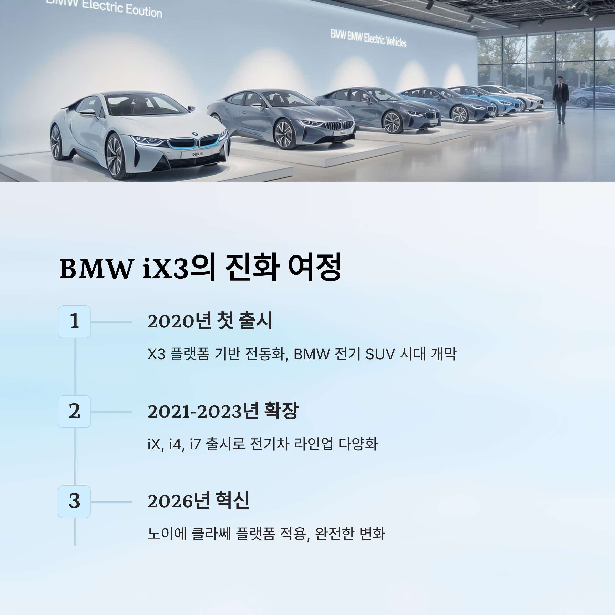 | 2026 | iX3 (풀체인지) | 노이에 클라쎄 플랫폼, 800km 주행 | BMW 전기 SUV 혁신 아이콘 |