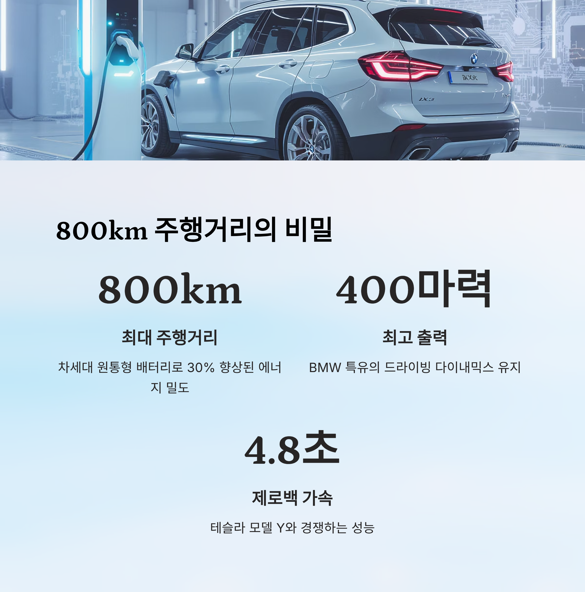 | BMW iX3 (2026) | 800km | 400마력+ | 약 4.8초 | 노이에 클라쎄, 예측 주행 시스템 |
