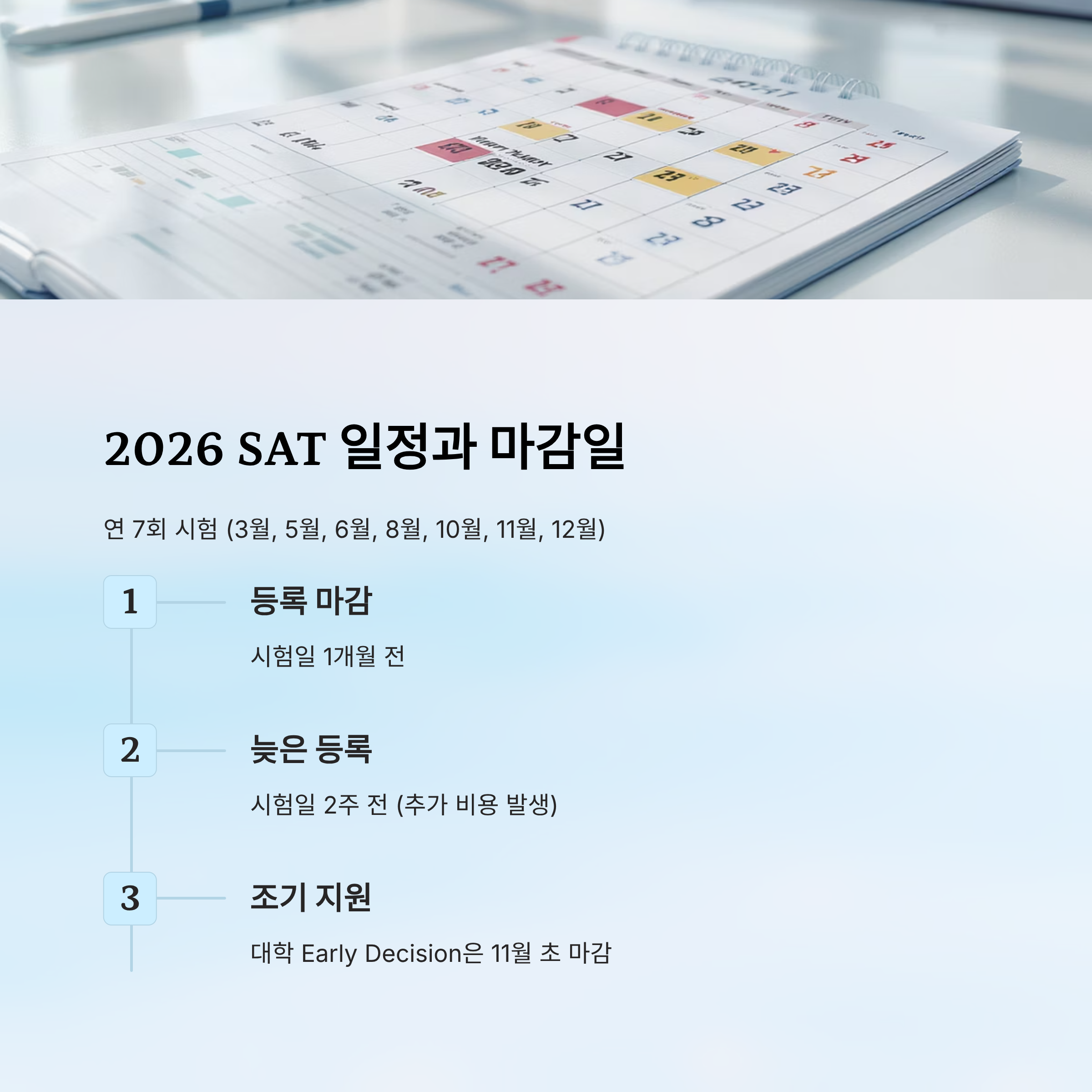 A2. 2026년 SAT는 3월, 5월, 8월, 10월, 12월에 예정되어 있어요. 보통 시험일 기준 약 1개월 전이 마감일이니 College Board 공식 사이트에서 반드시 확인하는 게 좋아요.