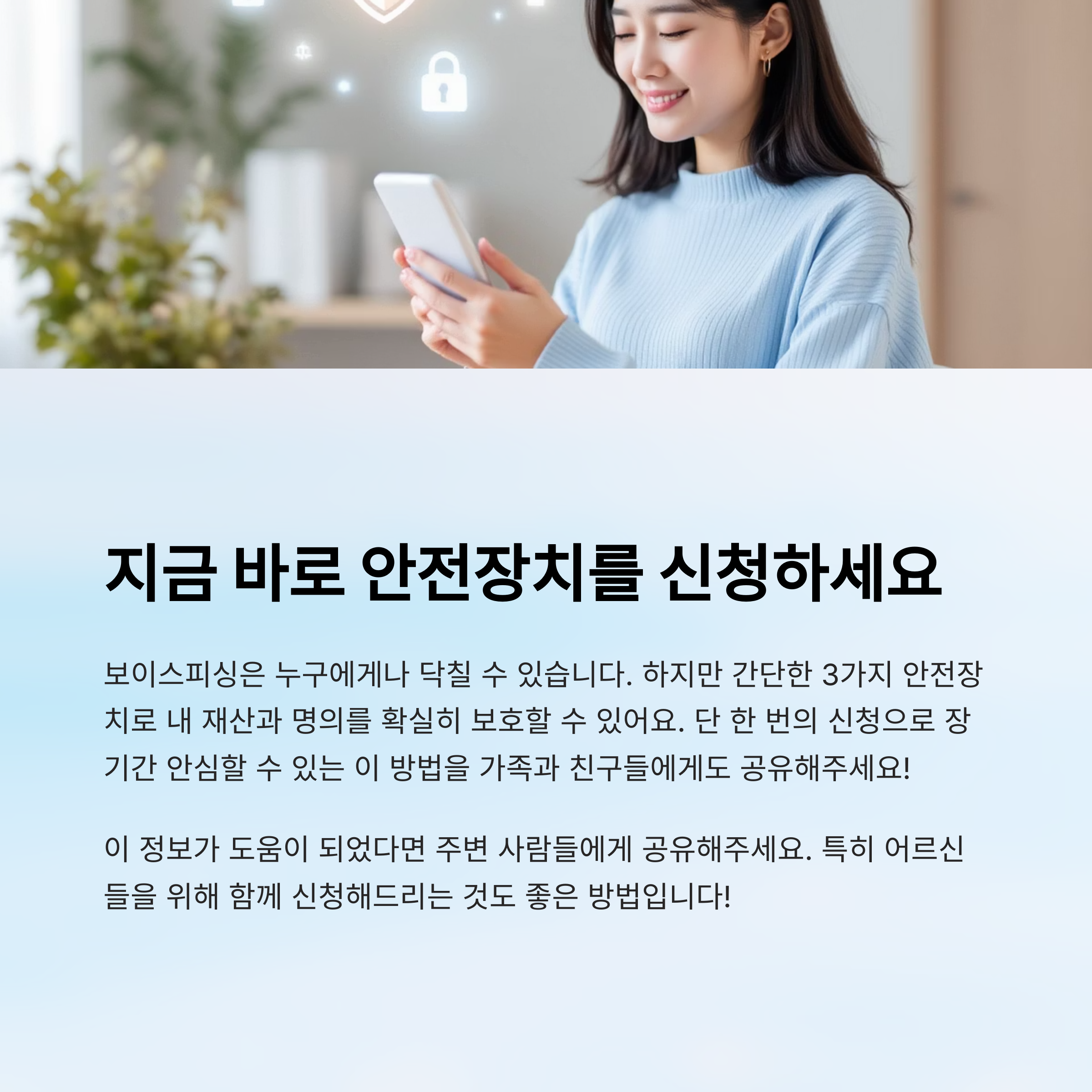 ‘설마 나한테 보이스피싱이 오겠어?’ 하는 마음이 들 수 있어요. 하지만 대부분의 피해자는 "나는 절대 안 당할 줄 알았다"고 말해요. 보이스피싱은 누구에게나 닥칠 수 있어요. 그렇기 때문에 선제적인 대응이 가장 현명한 선택이에요. 😌