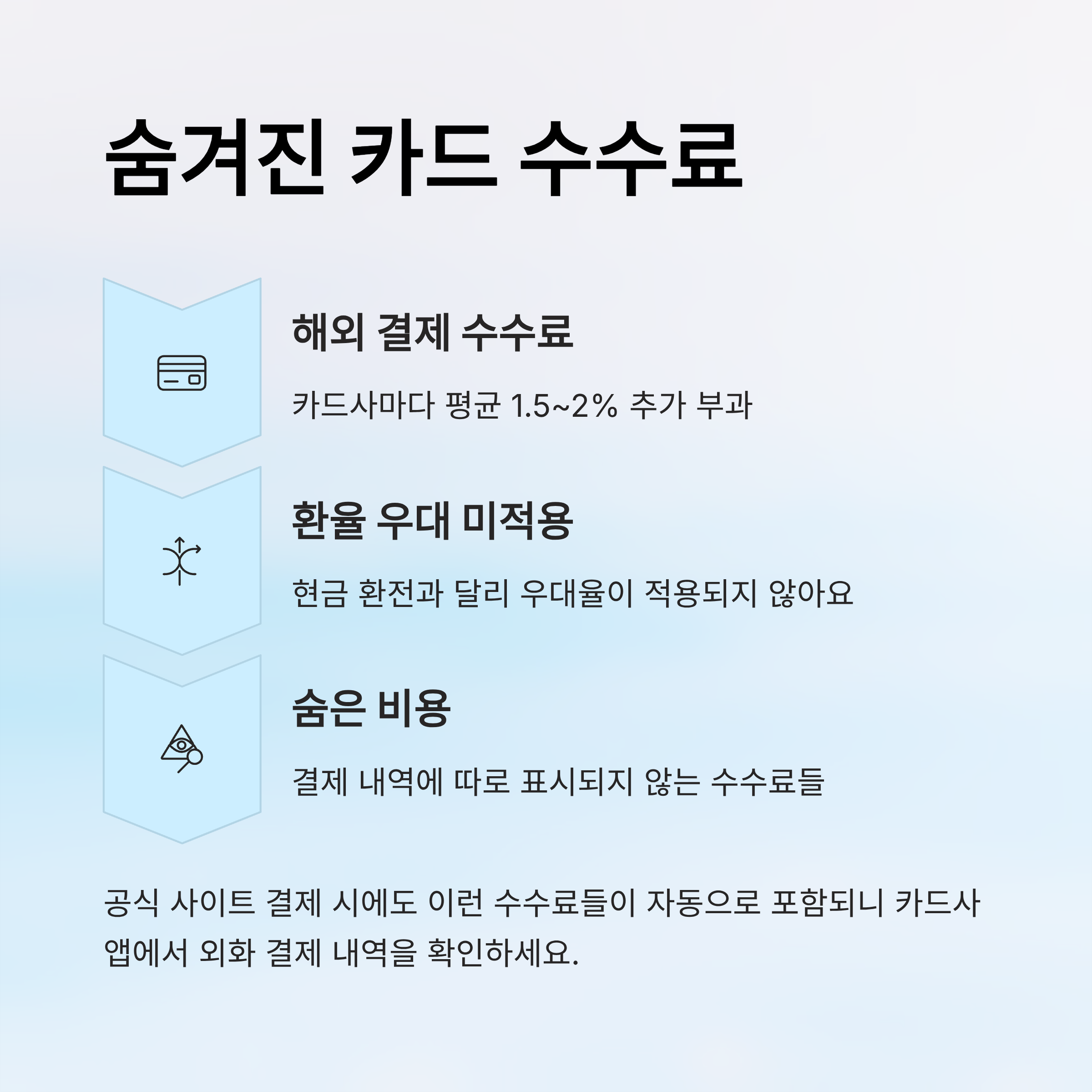 또 하나의 숨겨진 비용은 '카드 환율 우대율 미적용'이에요. 많은 분들이 현금 환전할 때는 우대율 90%를 받지만, 카드 해외 결제에는 그런 우대율이 적용되지 않아요. 그래서 단순한 환율보다 비싸게 결제되는 거예요.