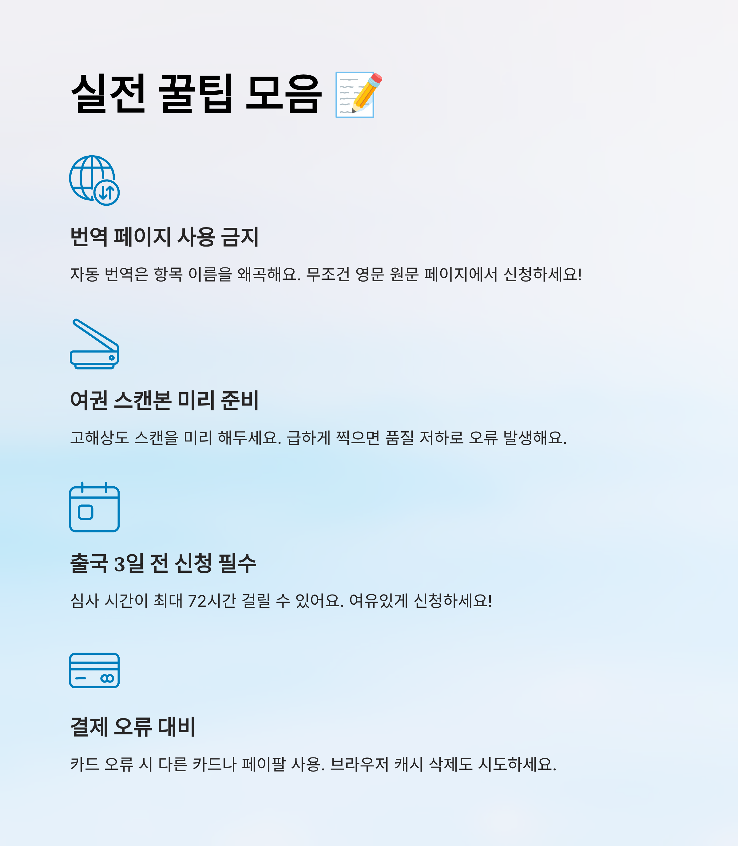 여기까지 읽으셨다면, 이제 거의 전문가 수준이에요! 하지만 마지막으로 진짜 중요한 꿀팁 몇 가지를 알려드릴게요. 이건 실제로 ESTA를 자주 신청하는 사람들이 입을 모아 말하는 핵심 포인트예요.