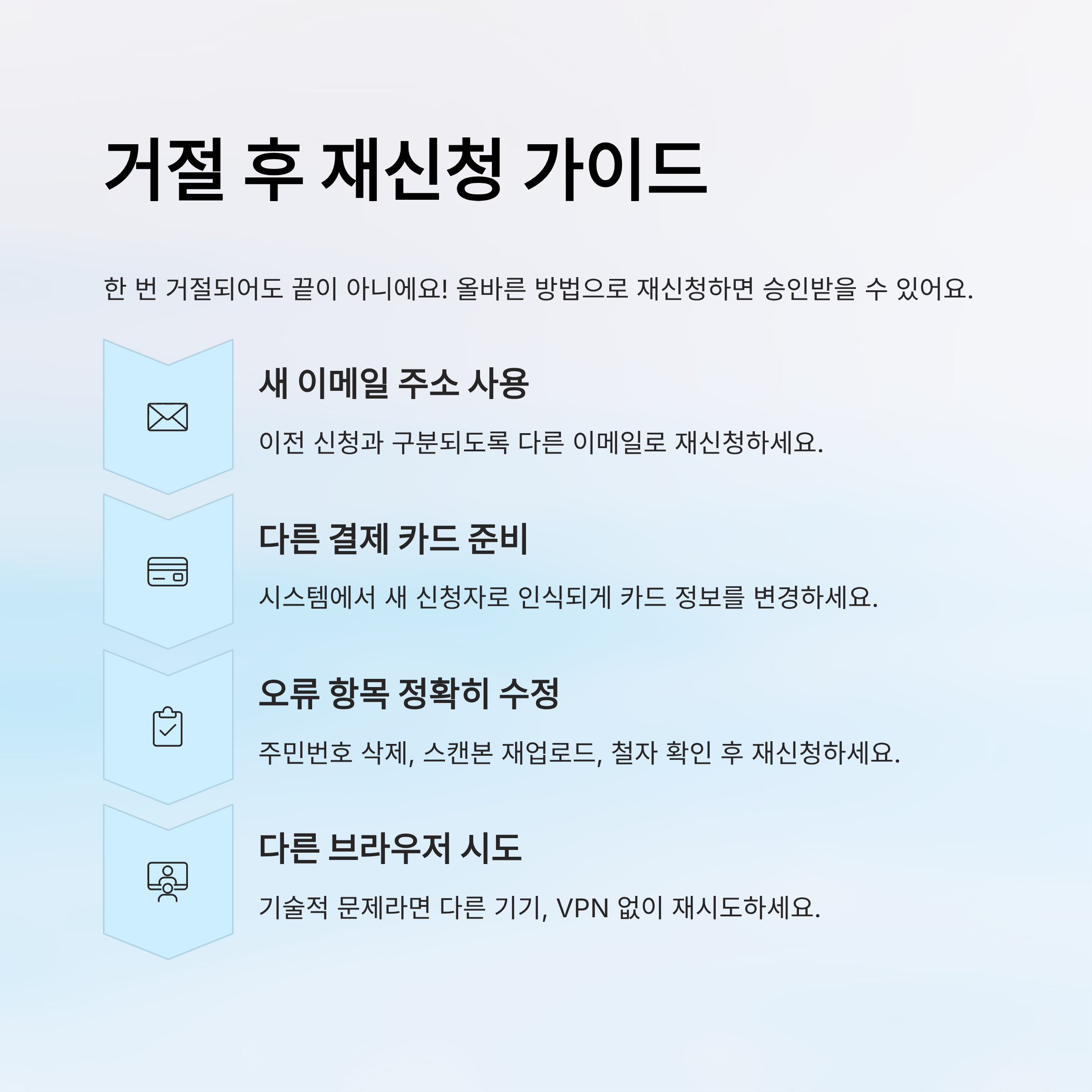 주민등록번호를 입력해서 거절된 경우, 새 이메일 주소와 다른 결제 카드를 사용하면 재신청이 가능해요. 이전 신청 기록과 구분되도록 시스템에서 새 신청자로 인식되게 하는 거예요.
