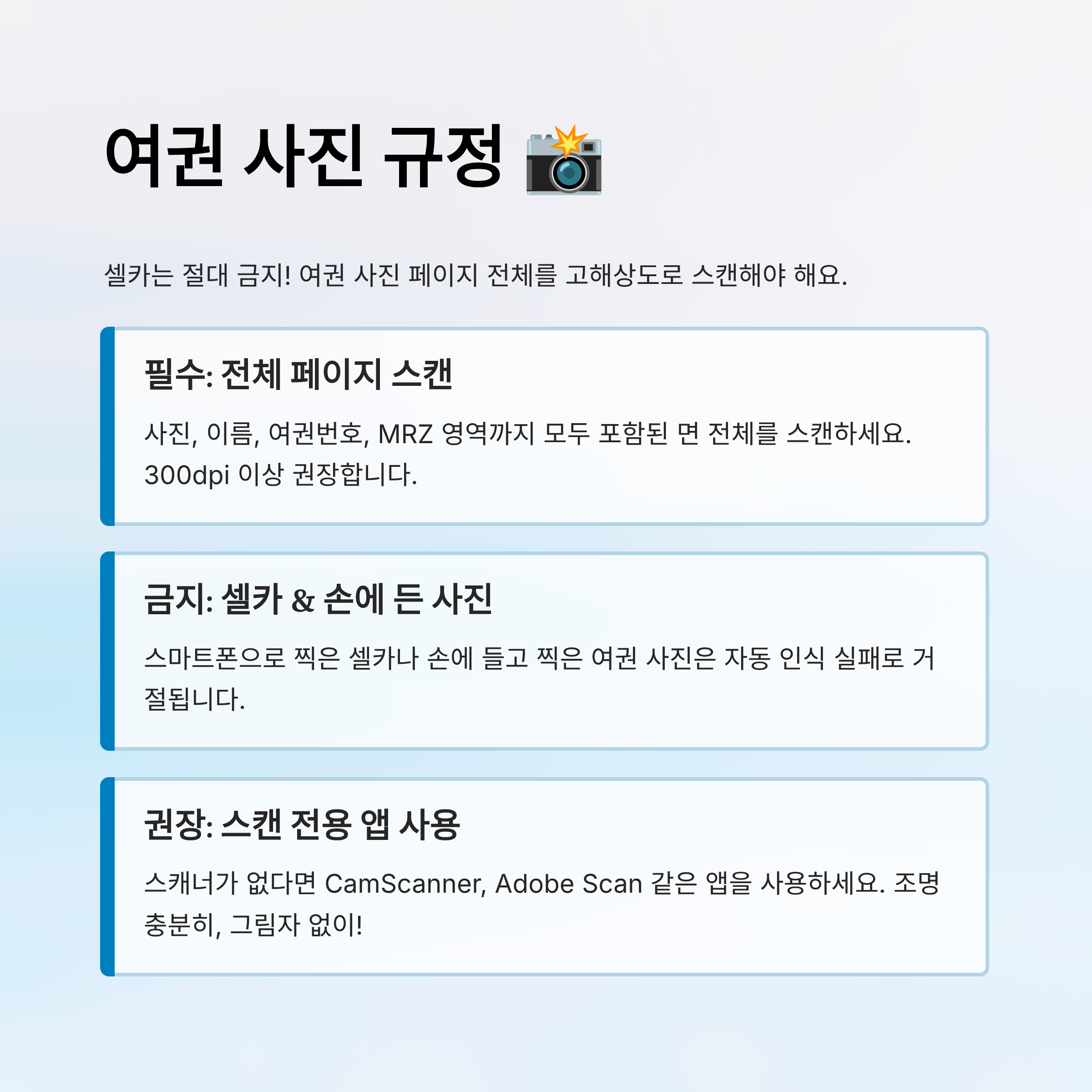 셀카 사진을 찍어서 첨부하거나, 여권을 손으로 들고 찍은 사진을 업로드하면 여권번호나 생년월일이 흐릿하게 나와 자동 인식이 불가능해져요. 결국 신청이 실패하거나, 나중에 입국 심사 때 문제 생길 수 있어요. 미국 입국은 디지털 정보의 정확도가 생명이에요!