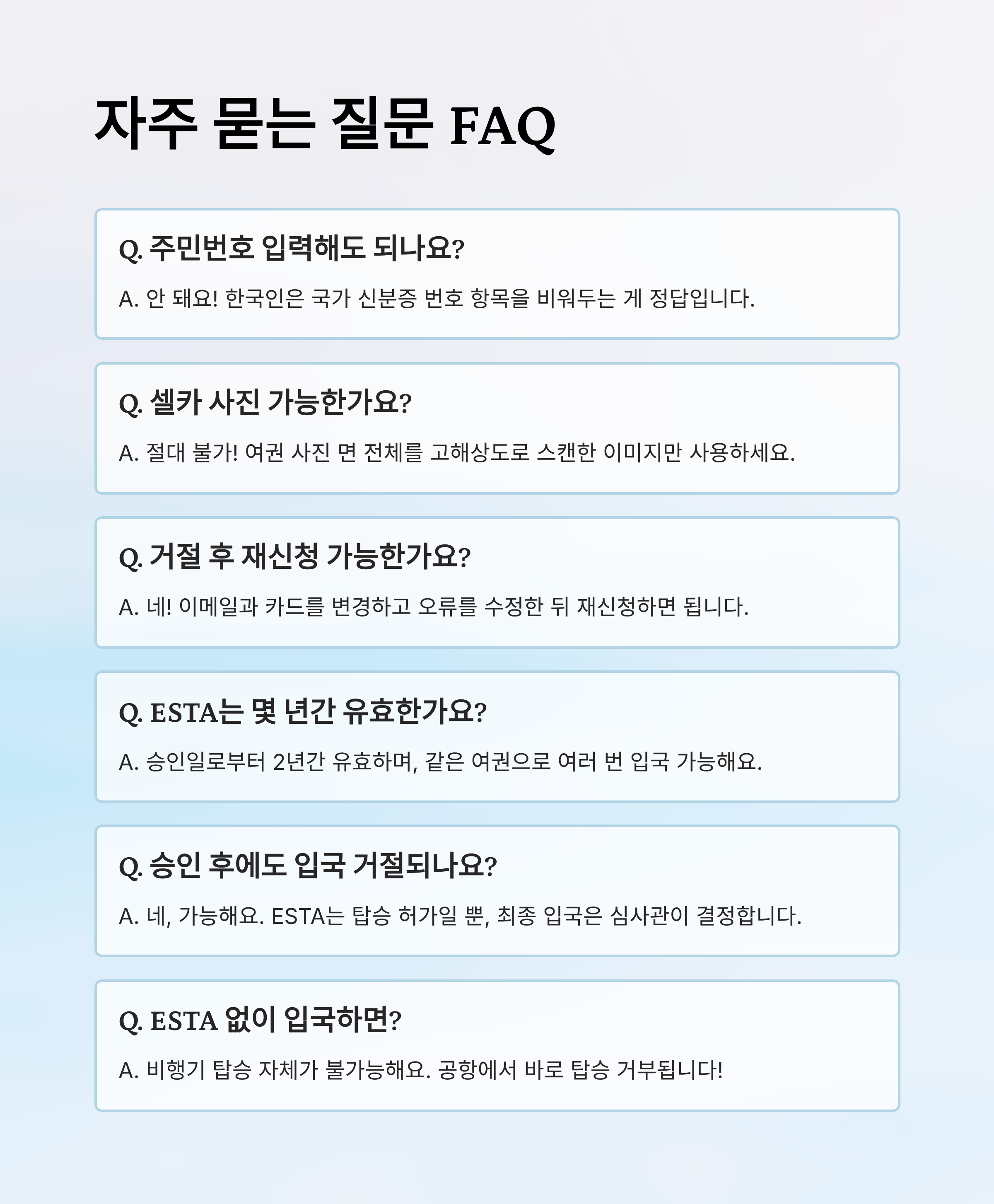 ESTA 신청 과정에서 작은 실수 하나로 거절되거나, 다시 신청해야 하는 경우가 정말 많아요. 이 섹션에서는 한국인이 자주 하는 실수와 실제 사례들을 모아봤어요. "에이, 이 정도쯤이야..." 하는 마음이 부메랑처럼 돌아올 수 있답니다.