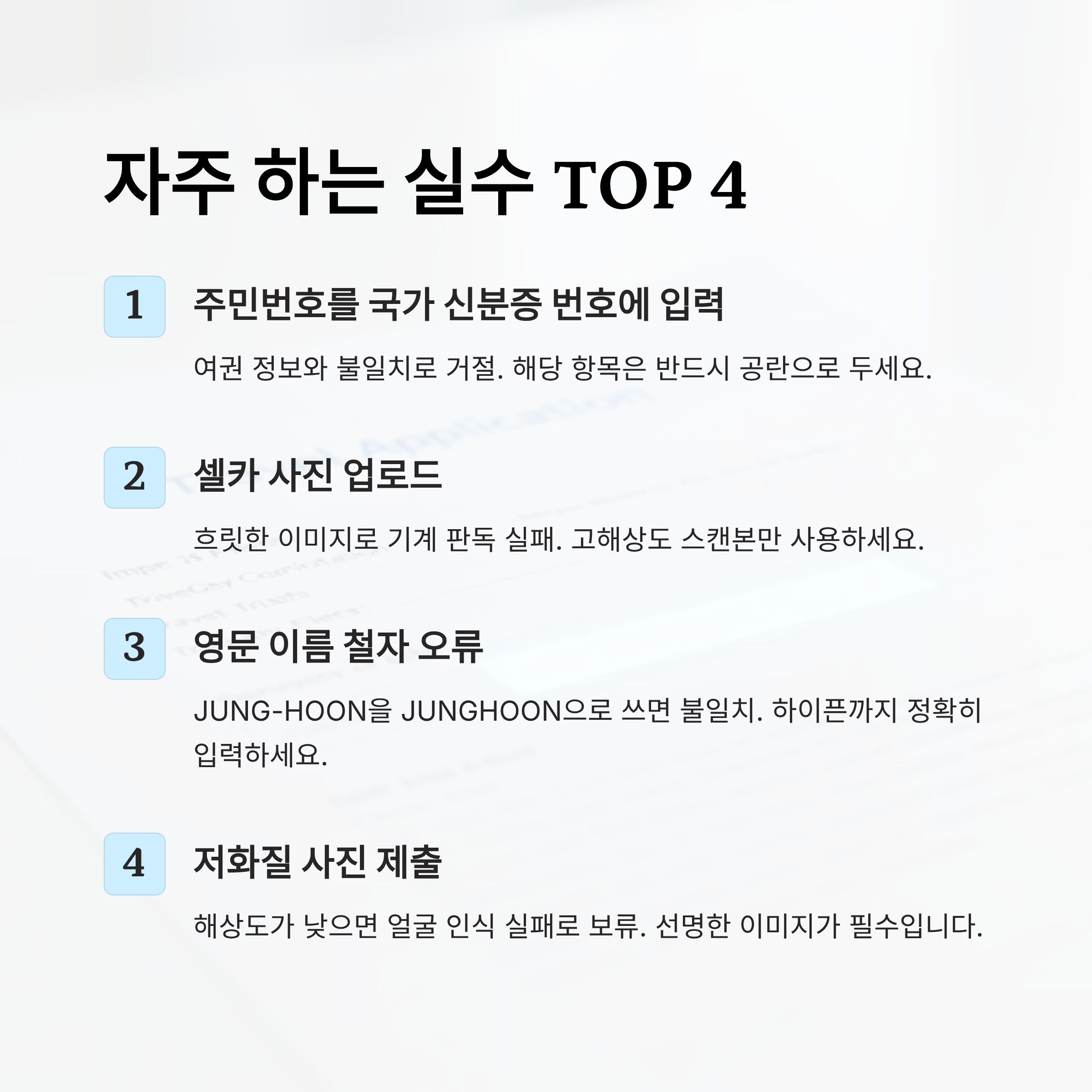 하이픈(-)을 빠뜨리거나 철자 오타로 인해 여권 정보와 불일치할 경우, 거절 가능성이 매우 높아요. 반드시 여권의 이름을 그대로 복사해서 입력해야 해요. 수정 후 재신청하면 대부분 해결돼요.