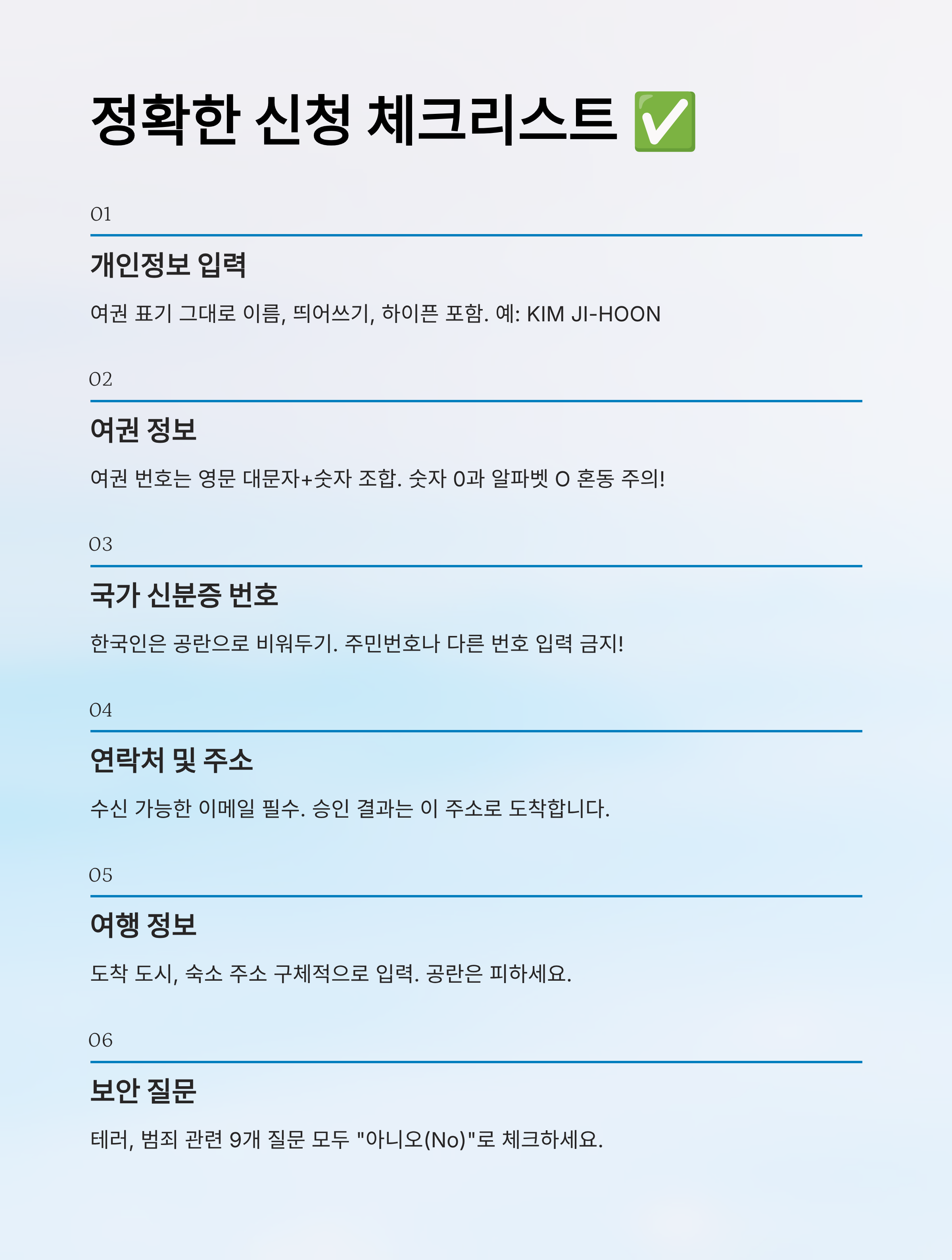 여기서는 한국인이 ESTA 신청할 때 놓치기 쉬운 항목들을 꼼꼼하게 확인할 수 있도록 체크리스트로 정리해봤어요. 실제 신청 페이지 기준으로 작성된 순서니까, 한 항목씩 따라 하시면 틀릴 일이 없답니다!