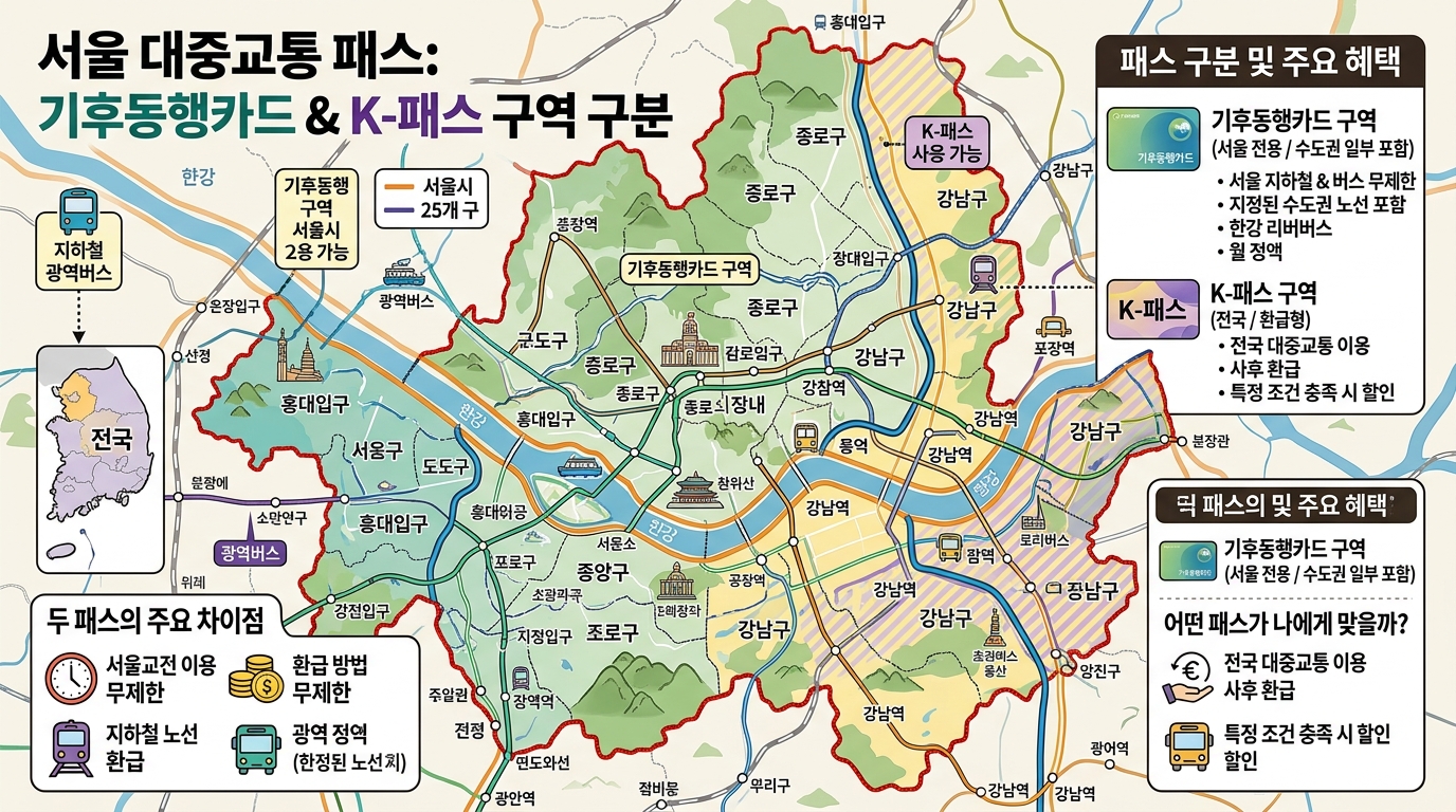 최근 2026년 들어서는 기후동행카드의 서비스 범위가 인접 경기도 도시(고양, 과천 등)로 확대되고 있지만, 여전히 K-패스의 전국 단위 적립 시스템을 따라오기엔 역부족입니다. 본인의 주 활동 반경을 구글 맵으로 한 번 그려보시면 답이 나올 거예요.