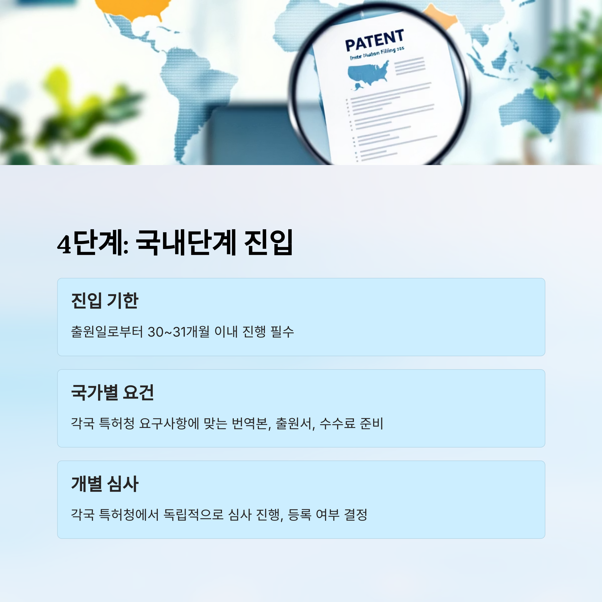 PCT 국제출원을 완료한 후, 출원인은 보호받고 싶은 개별 국가에 직접 특허를 출원해야 해요. 이를 '국내단계 진입'이라고 해요. 국내단계로 진입하는 기한은 출원일 기준으로 30~31개월 이내예요.